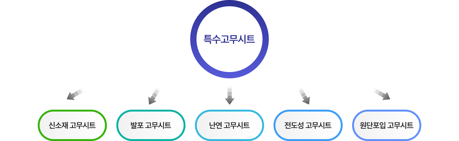 기존 천연고무/합성고무 보다 물리적/화학적으로 개선된 새로운 소재로 산업용, 전자제품, 자동차, 건축, 반도체, 2차전지 등 다양한 분야에 사용됨. 내열성/내화학성/내마모/내충격 등이 강화된 제품을 생산가능. 의료 기기, 반도체 제조라인, 항공/자동차/석유화학 설비, 기계부품, 반도체, 배터리팩, 전자기기 등 산업전반에 사용가능. |