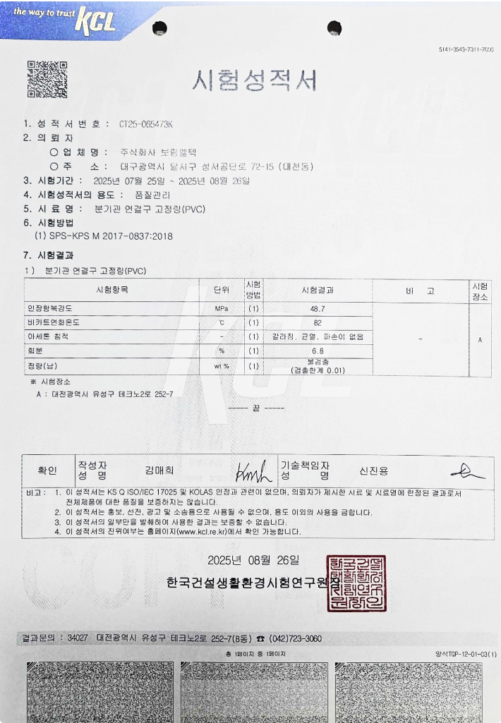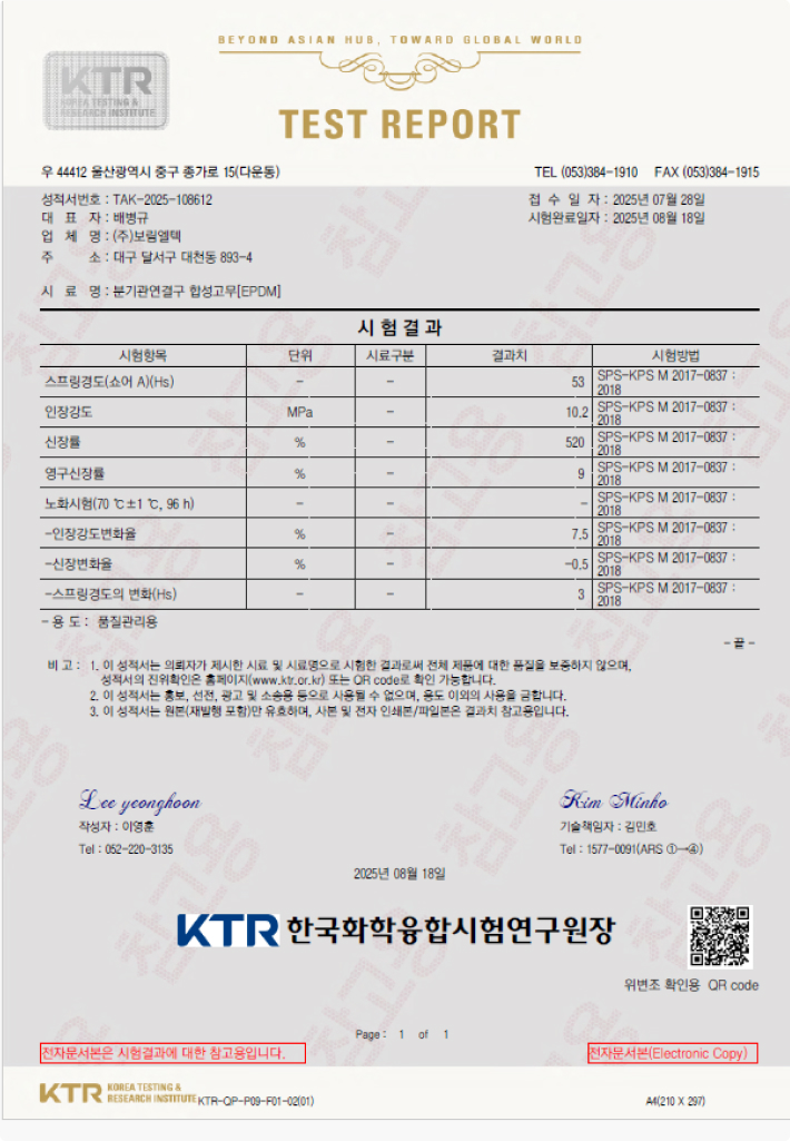 연결구 본체 본관과 분기관을 연결 고정링 본관에 삽입된 연결구 본체를 본관에 고정 관접합밴드 연결구 본체에 삽입된 분기관을 고정KTR 합성고무 (EPDM)