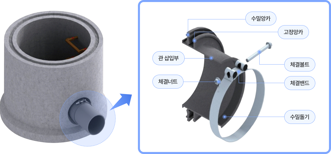 고무커넥터는 맨홀을 제작할 때 맨홀 접속구에 장착되어 일체형으로 생산되며 시공 현장에서는 하수관을 커넥터에 삽입 후 체결밴드만 체결함으로써 시공이 종료되어 시공성이 매우 뛰어나며, 하수관 연결부의 수밀성 및 내진성, 내구성을 획기적으로 향상시킨 제품입니다.