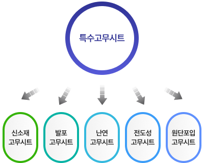불이 붙어도 스스로 꺼지거나, 화염확산을 최소화하는 특수시트. 자동차 엔진룸, 실내 내장재, 건축 내장재, 방화도어 씰링, 철도/항공기 내장용 시트, 2차전지 모듈 완충 및 단열층 등 산업전반에 다양한 용도로 됨. 실리콘 난연 고무시트, CR 난연고무 시트 등 우수한 품질의 V-0등급으로 생산중. |