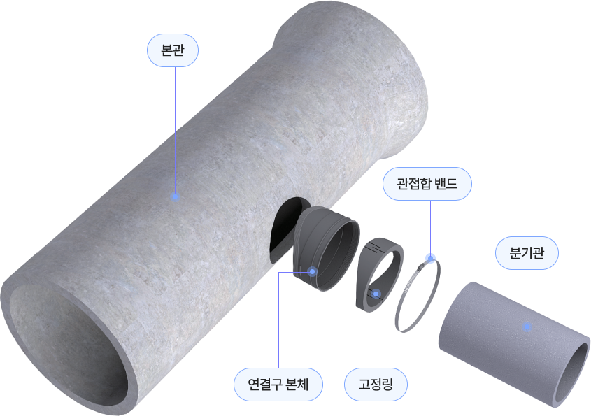 연결구 본체 본관과 분기관을 연결 고정링 본관에 삽입된 연결구 본체를 본관에 고정 관접합밴드 연결구 본체에 삽입된 분기관을 고정KTR 합성고무 (EPDM)